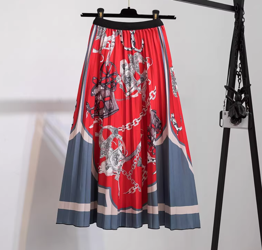 Chain Design Printed Pleated Skirt, Red