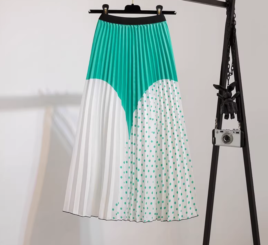 Printed Pleated Skirt, Green Polka-dot